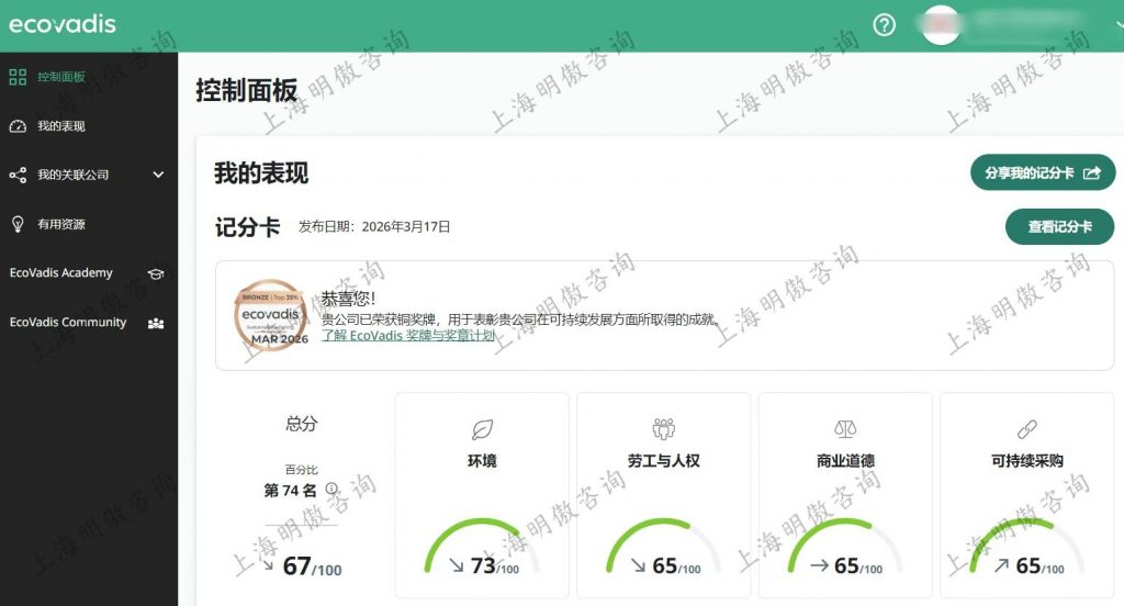 祝贺!某客户Ecovadis评级67分,获铜牌!作者: news / 2026年3月26日 2026年3月26日 祝贺我们服务的又一家客户在EcoVadis可持续发展评级中斩获67分铜牌。这是国际权威机构对企业践行ESG理念的最好认可。明傲咨询以专业经验助力企业高效提分,让您在践行ESG的道路上快人一步。