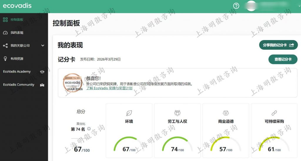 一边是新客户首战告捷,汽配工厂 EcoVadis 67 分铜牌,远超品牌 50 分门槛;