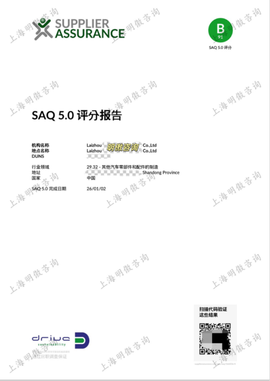 另有汽车零部件企业,首次参评SAQ评估便拿下91分的优异成绩,获评B级(绿色等级),轻松契合汽车行业供应链可持续发展的核心要求。