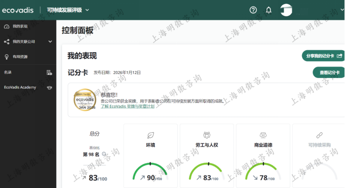 近日,我们的老客户最新EcoVadis评分正式发布,成绩堪称惊艳:继去年75分斩获金牌后,今年再度突破,以83分的高分稳居全球前2%,距铂金奖章仅1分之差,成功蝉联金牌认证。要知道,该客户与我们合作多年,从最初连续两次斩获银牌,到如今稳步迈向铂金,每一次跃升都是企业可持续发展能力的进阶。