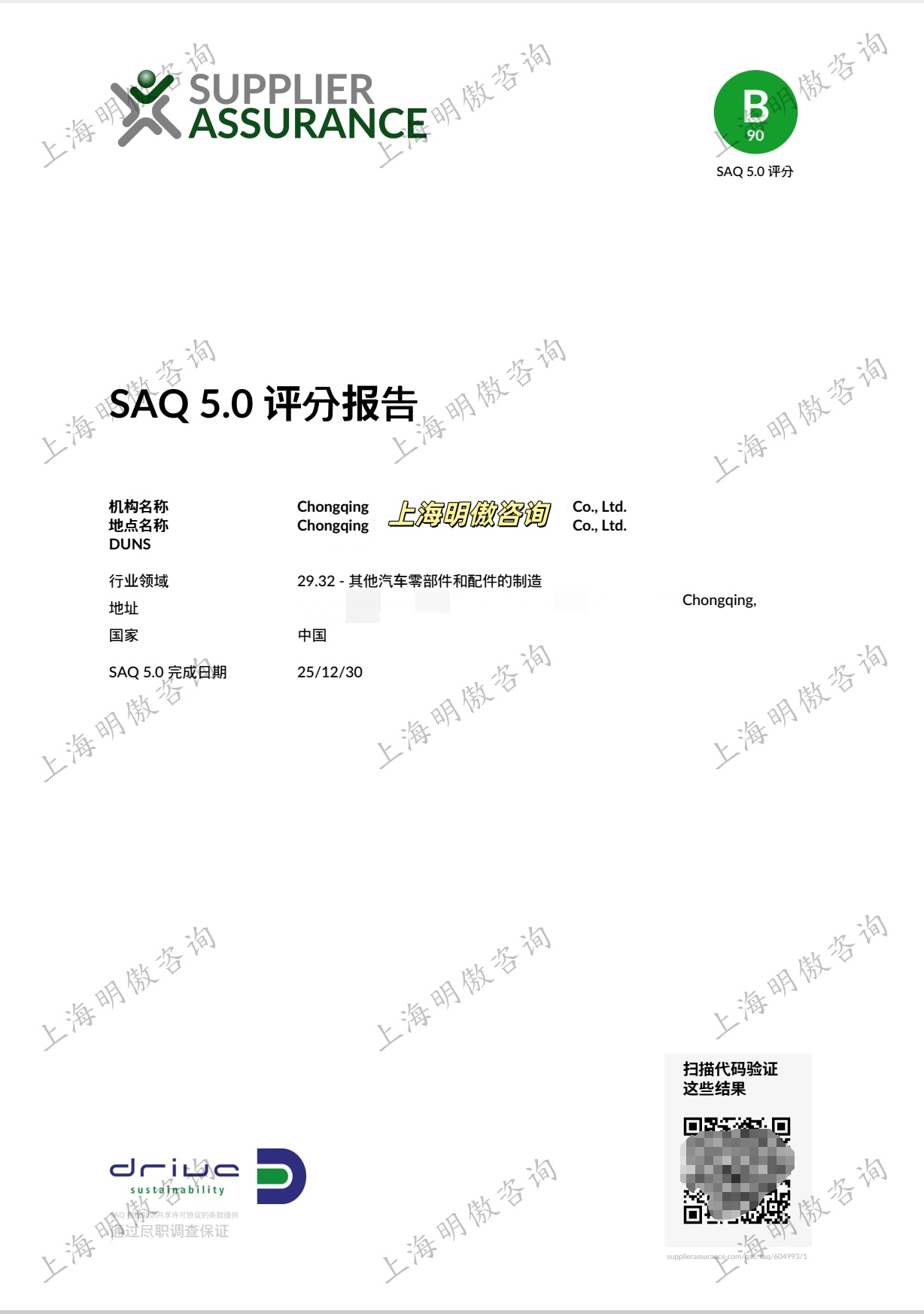 近几天又协助了2家大众、吉利和舍弗勒汽车零部件供应商完成了SAQ 5.0可持续发展评估,分别获得B80和B90
