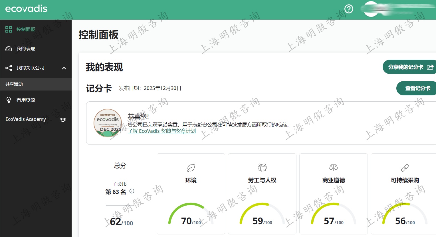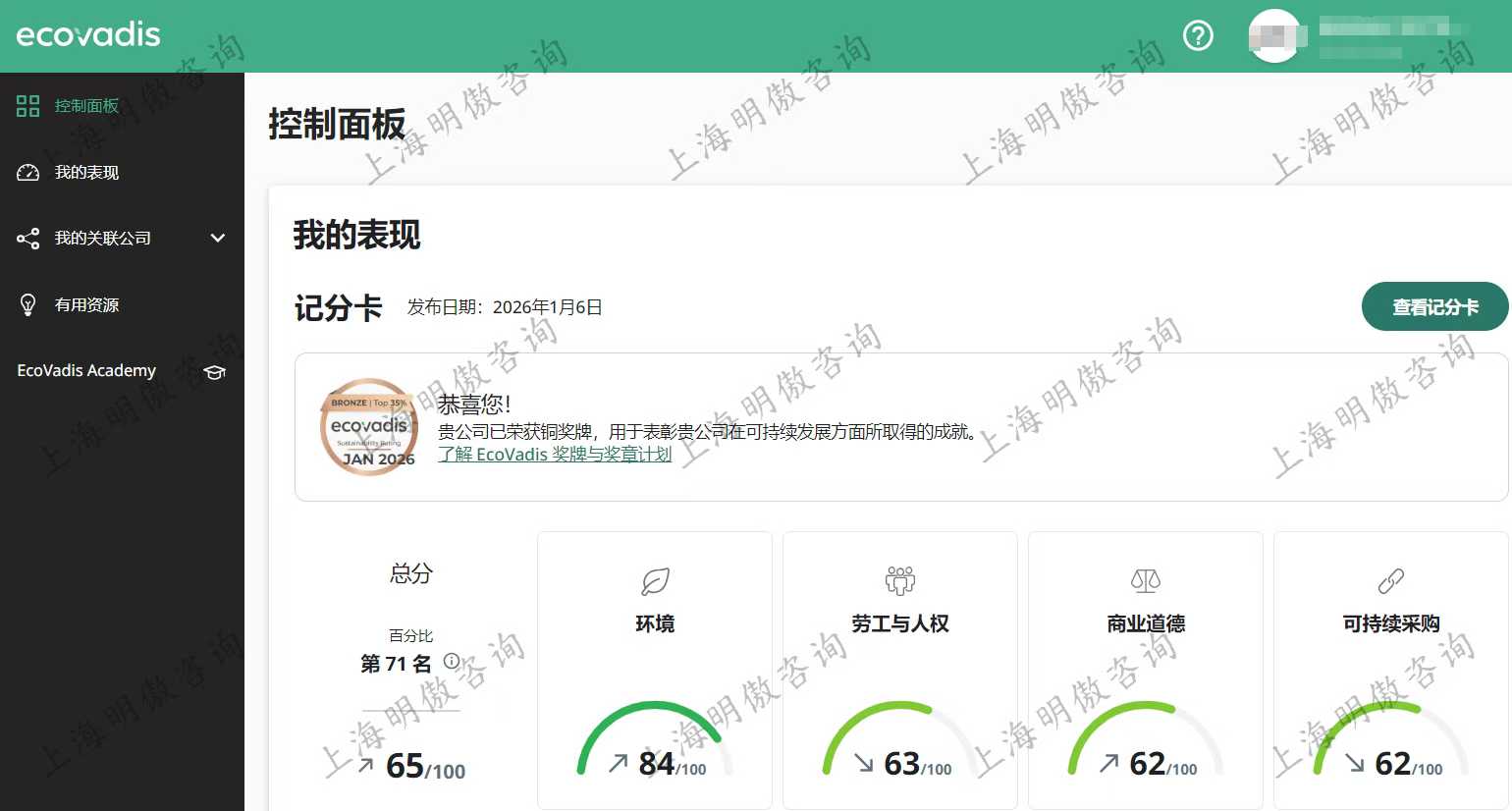 祝贺!某家企业Ecovadis评分62分,获铜牌!