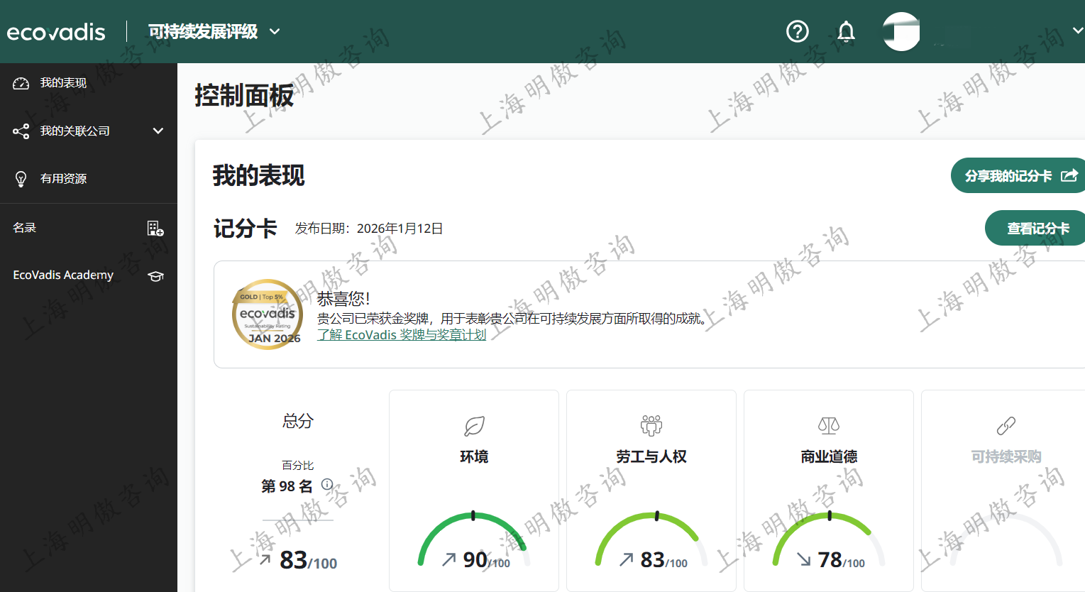 祝贺!明傲服务的老客户EcoVadis评估继去年75分金牌后,今年继续大幅提升,获得83分,金牌,排名全球前2